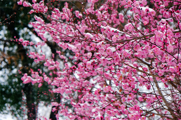 雪中赏梅,为一大雅事。在武汉植物园小梅园,怒放的朱砂梅、宫粉梅、江梅被白雪压枝,更显清绝风骨。虬劲的枝干上,积雪勾勒出遒劲的线条,而点点红梅、粉梅缀满枝头,不与雪争色,只以清雅示人。粉瓣凝晶,薄透如玉,与枝头莹雪相映成画。虬枝横斜,雪映嫣红,疏影暗香自成一景。细雪纷飞中,游客或驻足细赏,或举起手机记录这难得一见的“雪压梅枝”之美。