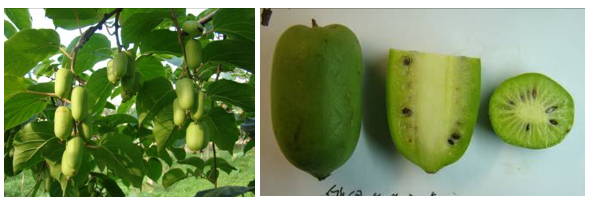 果实长圆柱形,果形漂亮,平均果重10~15克,果面光滑,绿色。果肉黄绿色,软熟果实含可溶性固形物16 %~20%、可溶性总糖9.7%、总酸1.0%、维生素C 208毫克/100克。果实耐贮性一般,8月初采收后在常温27~34℃条件下第8天开始软熟,低温(3-4℃)下采后第13 天开始大部分果实软熟。