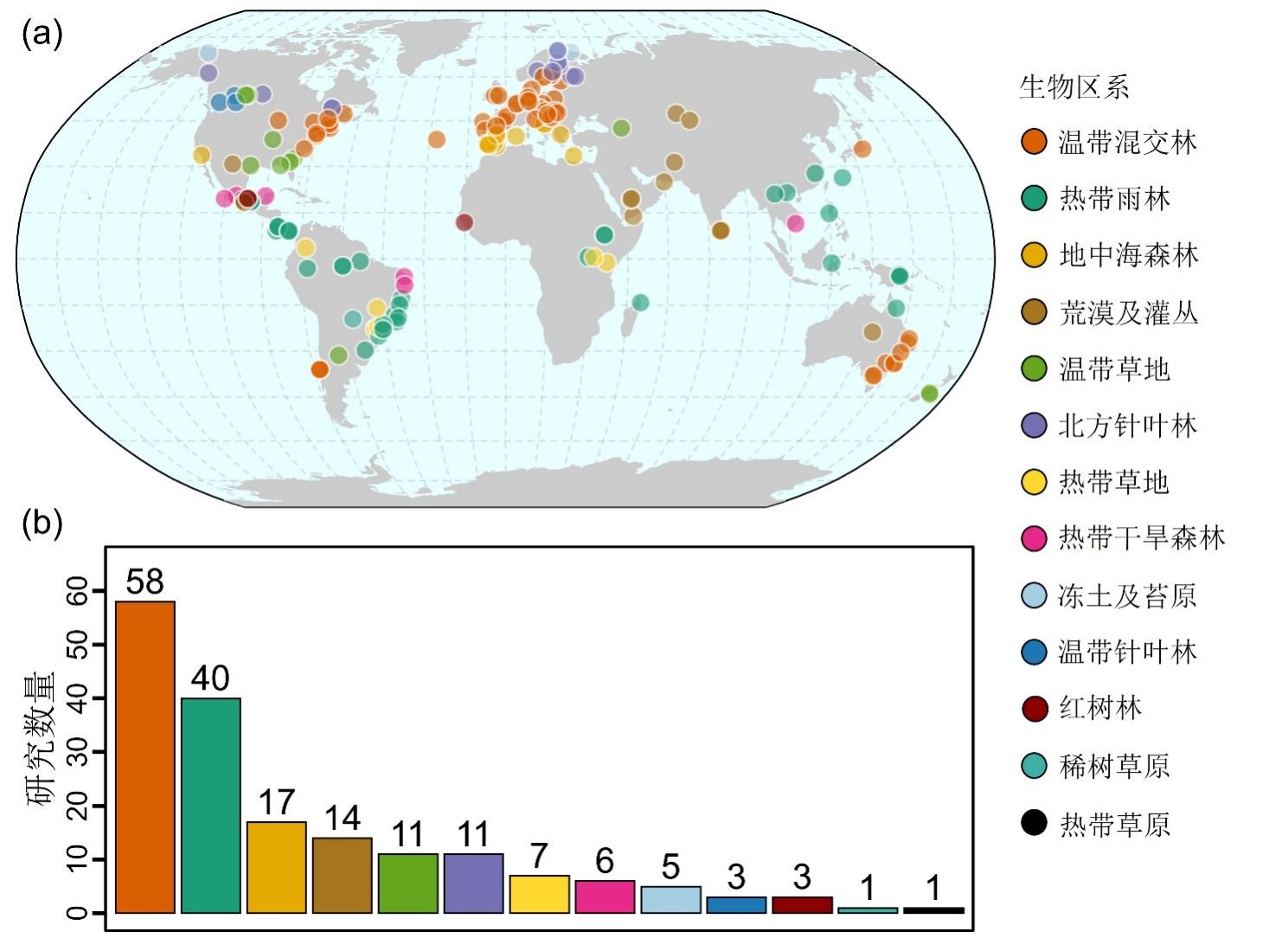 a. 以往研究的地理分布及对应生物区系;b. 不同生物区系的研究数量。