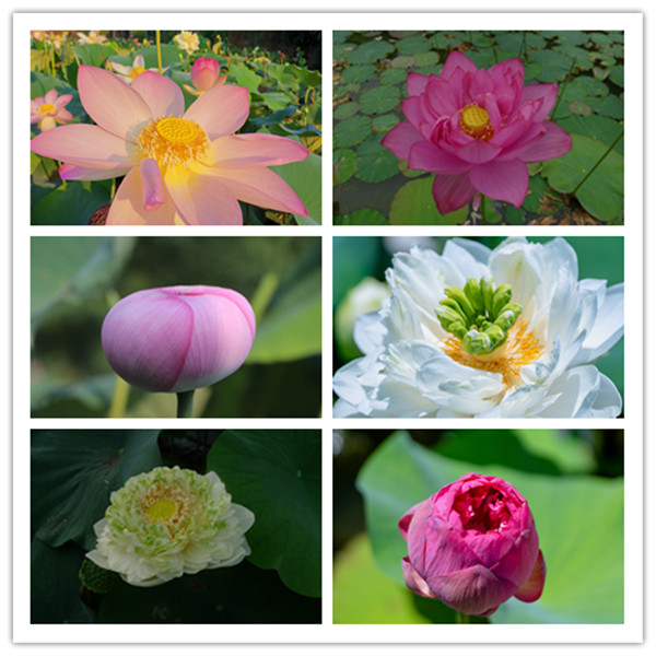 红、粉、黄、橙、白、绿,各色荷花映入眼帘。不同于常见的红粉色系,这里的荷花色彩丰富,除了纯色荷花,还有红黄配、红白配、白绿配的复色荷花。