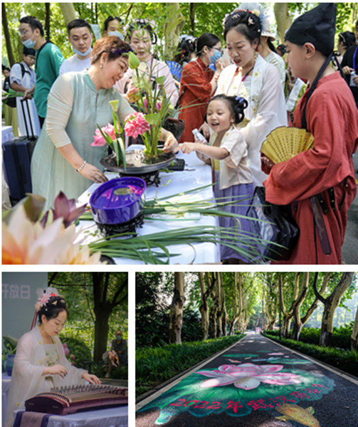 荷塘里风姿绰约、清香浮动,荷岸边裙裾翻飞、衣袂翩跹。归梦廊汉服社的汉服爱好者们带来了古筝表演、香道展示、国风舞蹈表演,吸引了不少公众观看。“鱼戏莲叶间”3D荷花地画也为现场增添了不少乐趣。