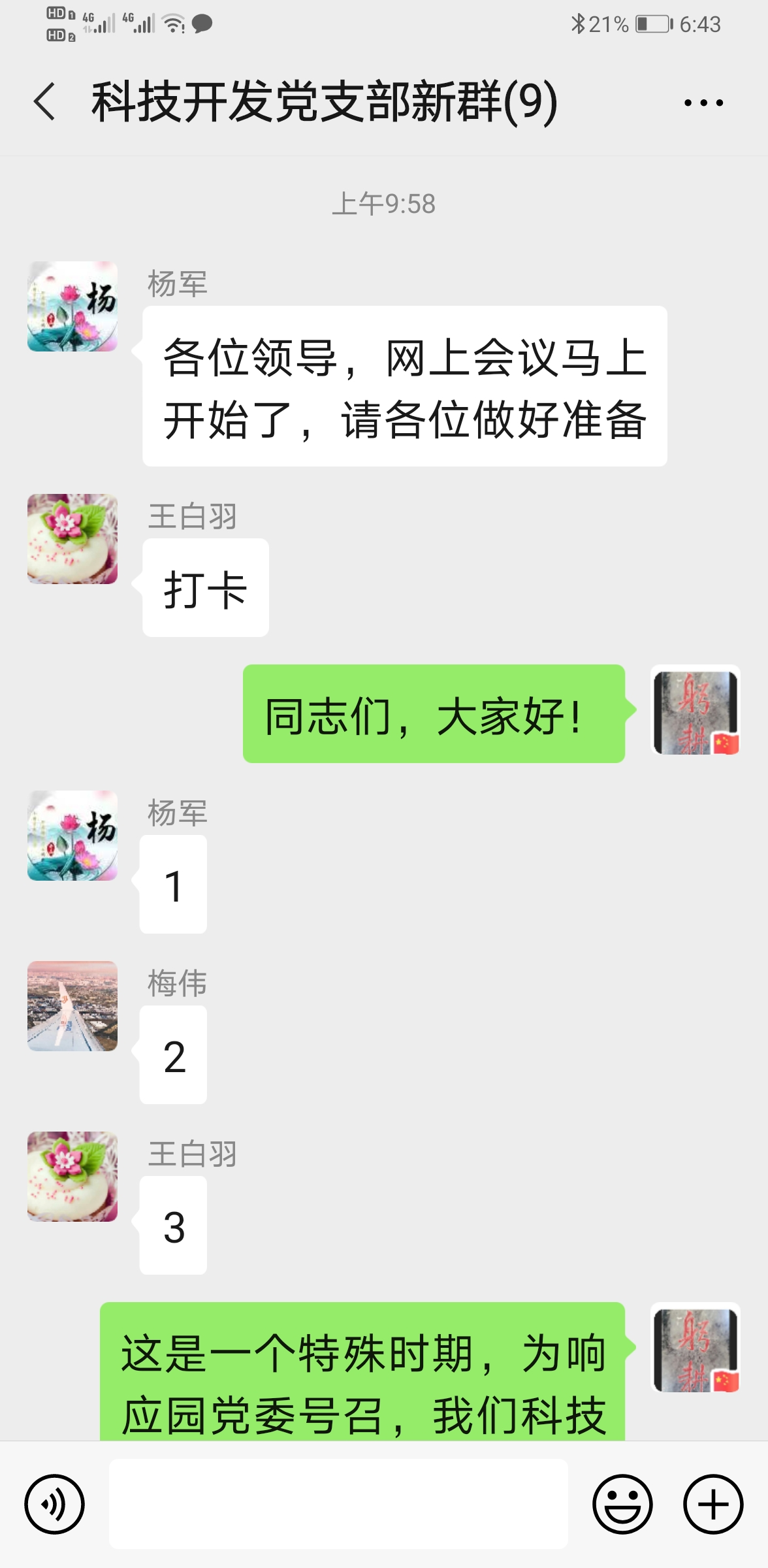 最后,大家表示在这种特殊时期,开展这种形式的主题党日活动不仅很新颖也很有必要,希望支部以后能多组织类似活动,给大家更多交流的平台。
