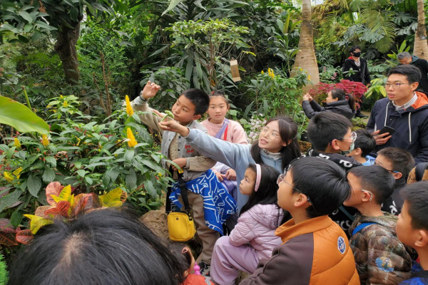 走进武汉植物园景观温室,游客不仅能既能够欣赏品种繁复多样、姿态各异的兰花,还能够仰望高大挺拔、生机勃勃的武伦柱、旅人蕉、龙血树等,正应了那句“阳春布德泽,万物生光辉”。为提升游客体验,活动特别设置了讲解环节。亲子家庭以小组为单位,跟随科普老师探秘景观温室,从形似黄虾的金苞花到异色并蒂的鸳鸯茉莉,解密“滴水叶尖”、“植物界的老寿星”等,讲解将植物名字与特征相结合,配以相应的背景故事“龙血”的来历与趣味问答“鸳鸯茉莉最开始是什么颜色的”等,给游客上了一堂生动有趣的自然科普课。