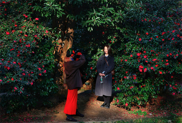 也可选择花径漫步,茶梅树下的小径铺满落红,形成天然的“花瓣地毯”。漫步其中,以花海为背景,无论是抓拍行走的瞬间,还是静立赏花,都能轻松获得氛围感人像。建议选择低角度拍摄,让落花前景与繁花背景形成层次。还可以考虑树下特写,选择一棵花枝低垂、形态优美的茶梅树,站在树下微微仰头。让满树繁花作为天然“花棚”,阳光透过花瓣缝隙洒下斑驳光影,人物肤色瞬间提亮,冬日暖阳感十足。茶梅花瓣精巧,花蕊玲珑,也非常适合微距特写,捕捉花瓣上的露珠、纹理,发微信朋友圈绝对收获高赞。时间选择上,晴日早晨8-10点、下午3-5点光线最佳。若遇蒙蒙细雨或雨后初晴,花瓣带露,更显娇艳,别有一番韵味。