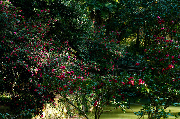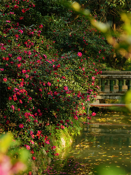 濬溪桥周边是茶梅最密集、景观最丰富的区域。大片茶梅依水而植,花开如火如荼,与古朴的小桥、潺潺的溪水、苍劲的树林共同构成一幅生动的冬日画卷。站在桥上,可以拍到花海与溪流的交融;也能低机位仰拍繁花、小桥与天空的框架构图。清晨或午后光线柔和时,水面泛起粼粼波光,与茶梅的倒影相映成趣,是拍摄风景照的绝佳时机。芙蕖亭附近有几棵高大的茶梅,已是繁花满树。在该处利用亭台、石凳、流水作为前景或框架,茶梅花海作为主体,可增加画面的故事性和层次感。