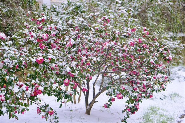 不畏严寒的茶梅,如风雪中的“俏佳人”,在雪中绽出“俏丽”春光。园内1000多株茶梅正值盛花期,它们以繁花满枝的姿态,在素色天地里泼洒出大块大块的明媚色彩,为清冷的空气注入一股鲜活的暖意。翠绿的枝叶托起松软的白雪,粉红、大红色的花朵从白雪中热烈地探出头来,红白相映,粉妆玉砌。近处花朵娇艳欲滴,远处花树影影绰绰,在积雪覆顶的树林衬托下,层次丰富,色彩对比鲜明,绘就一幅动人的“雪中点彩图”。