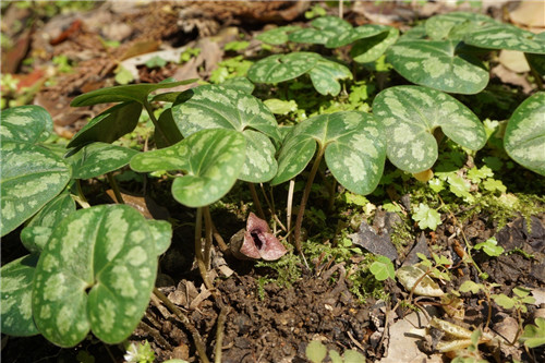 大叶马蹄香Asarum maximum Hemsl.也是细辛属中名字特别的,密集的大型花朵紧簇生于叶丛之下,因其花被裂片白色与紫黑色形成鲜明对比,使其花朵醒目,颜值显著提升。