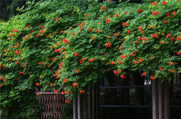 初夏时节,武汉植物园花径大道的藤廊上朵朵火红的花儿点缀着绿叶屹立于枝头,这便是凌霄花热情绽放的样子,十分美丽耀眼。