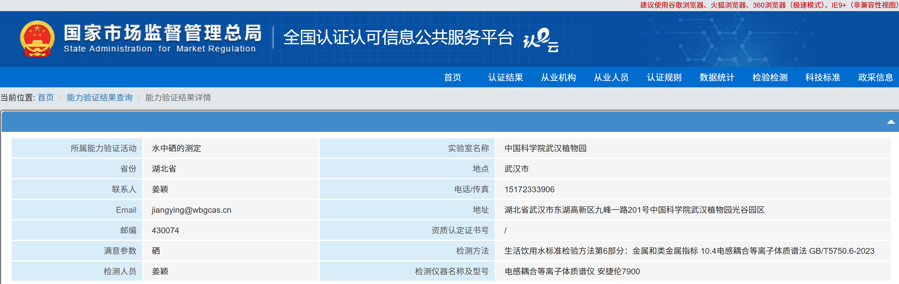 武汉植物园公共实验平台通过“水中硒的测定”实验室间比...