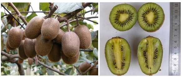 由江苏省徐州市果园于1975年从北京植物园引入的美味猕猴桃实生苗中选出,1990年11月通过省级鉴定(卫行楷,1993)。果实圆柱形,整齐,平均果重70~110克,果皮黄绿色,被黄褐色茸毛,梗洼平齐,果顶微突。果肉绿色,汁液多,肉质细嫩,具草莓等多种果香味,酸甜适口,含可溶性固形物13 %~20 %、总糖12 %、总酸1.3 %、维生素C 99~123毫克/100克鲜重;果实在室温下可存放30 天左右,耐贮藏。在武汉植物园种植,平均果重50 克左右,硬果后熟需要20天,较耐贮藏,软熟(硬度0.4千克/平方厘米)果实含可溶性固形物14 %,总糖14 %,总酸1.0 %,维生素C 100 毫克/100克鲜重。