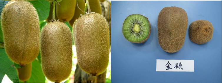 果实长椭圆形,整齐美观,平均果重120克,果肩圆,果顶凸;果皮黄褐色,绒毛柔软较密,果点小,果柄短粗,果实后熟后果皮易剥离,食用方便(图14)。果肉绿色,果心长椭圆形,浅黄色,肉质细腻,风味浓,含可溶性固形物17 %、总糖9 %、可滴定酸1.8 %、维生素C 70~100毫克/100克鲜重。果实耐贮性较强,常温条件下可贮藏20~30 天。