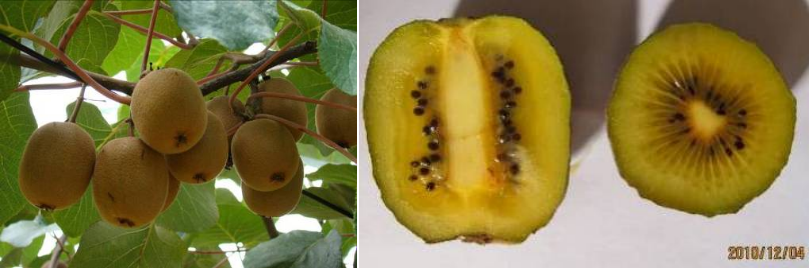 果实短圆柱形,平均果重84克,果面黄褐色,密被短绒毛,不脱落,果喙端平或微凹,果肩平,美观整齐,与园区保存的父本中华红肉猕猴桃雌株所结果实极相似。果实横切面为圆形,中轴胎座小,质地软,可食用。果肉金黄或深橙黄色,细嫩多汁,风味浓甜微酸,含可溶性固形物14 %~17 %、可溶性总糖10 %、有机酸1.3 %、干物质含量17 %、维生素C 122 毫克/100 克鲜重,矿质元素含量丰富,其中含钾220 毫克/100克,含钙35 毫克/100克(图13)。果实极耐贮藏,当可溶性固形物含量在8.6 %时采收,果实需要34 天软熟。在贮藏过程中果皮易失水起皱,贮藏期间需要保湿。