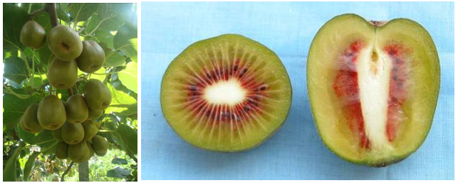 果实长圆柱形兼倒卵形,平均果重65克,果顶、果基凹,果皮绿色或绿褐色,茸毛柔软易脱落,皮薄。果肉黄绿色,果心白色,子房鲜红色,沿果心呈放射状红色条纹,果实横切面呈黄、红、绿相间色泽,具佐餐价值;含可溶性固形物16 %~20 %、总糖9 %~14 %、有机酸0.1 %~0.5 %、维生素C含量为136毫克/100克鲜重,肉质细嫩,口感鲜美有香味。果实较耐贮藏,采后10~15 天后熟(王明忠等,2003)。在武汉植物园种植,由于夏季高温干旱,果实生长受阻,平均单果重60克,软熟果实(硬度0.5千克/平方厘米)含可溶性固形物16 %、总糖14 %、总酸1 %、维生素C 83毫克/100克鲜重,果肉黄绿色,不表现红色或仅有红色印痕。