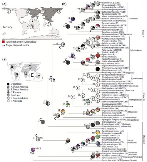 泽泻亚纲的生物地理学研究。(a) 祖先分布地理分析中所采用的世界地理划分;(b)泽泻亚纲的祖先地理分布重建;(c) 泽泻亚纲的祖先分布区域和主要的扩散路径。