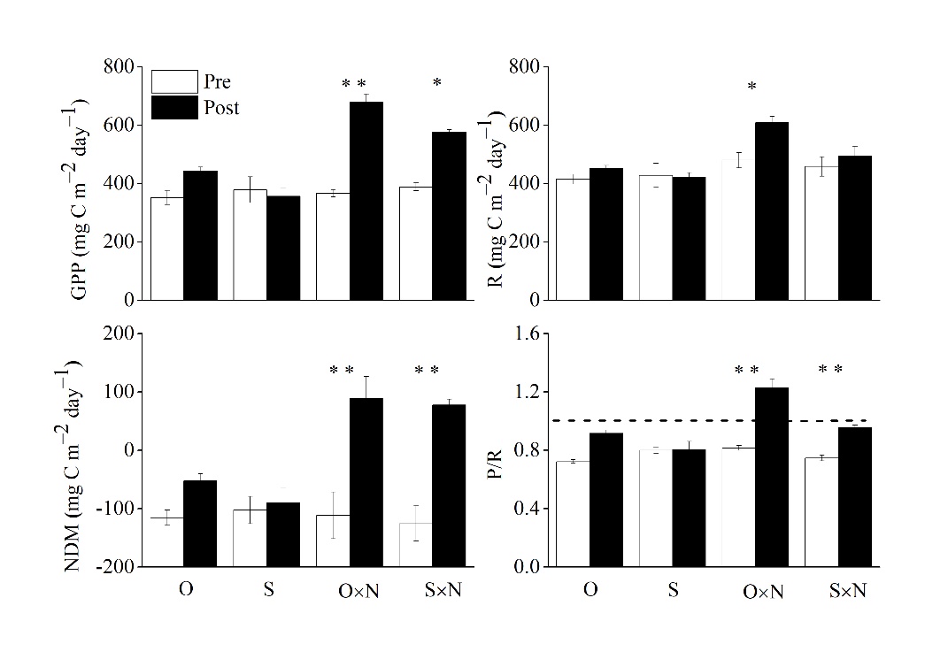 中国科学院水生植物与流域生态重点实验室、武汉植物园系统生态学学科组博士研究生张健在谭香副研究员、张全发研究员的指导下,在中国亚热带地区选取了三条人为干扰极少的河流进行原位河道遮盖和营养添加实验,研究了附石藻类群落结构和功能对光强和营养变化的响应。结果发现,以硅藻为主的附石藻类群落结构,对营养添加和光强减弱处理的响应存在显著差异。营养添加增加了附石藻类和硅藻的密度,以及聚集生活型、浮游型和高姿态型 (high profile) 硅藻的相对含量,但减少了低姿态型(low profile)硅藻的相对含量。河道遮盖增加了低姿态型硅藻,但减少了贴壁生活型、浮游型和高姿态型硅藻的相对含量。附石藻类群落代谢,包括总初级生产力(GPP),净初级生产力(NDM)和总初级生产力GPP/呼吸R(P/R)随营养添加而增加,而呼吸(R)仅在未遮盖并添加营养时增加。附石藻类群落GPP与硅藻密度显著正相关(p < 0.01,R2 = 0.9425)。本研究的结果揭示了河道接收的光强和水体营养元素浓度显著影响附石藻类群落结构,进而影响附石藻类群落功能,且硅藻密度是亚热带森林河流中附石藻类初级生产力的良好替代指标。量化这些驱动因素对于河流生态系统可持续性的健康管理至关重要。