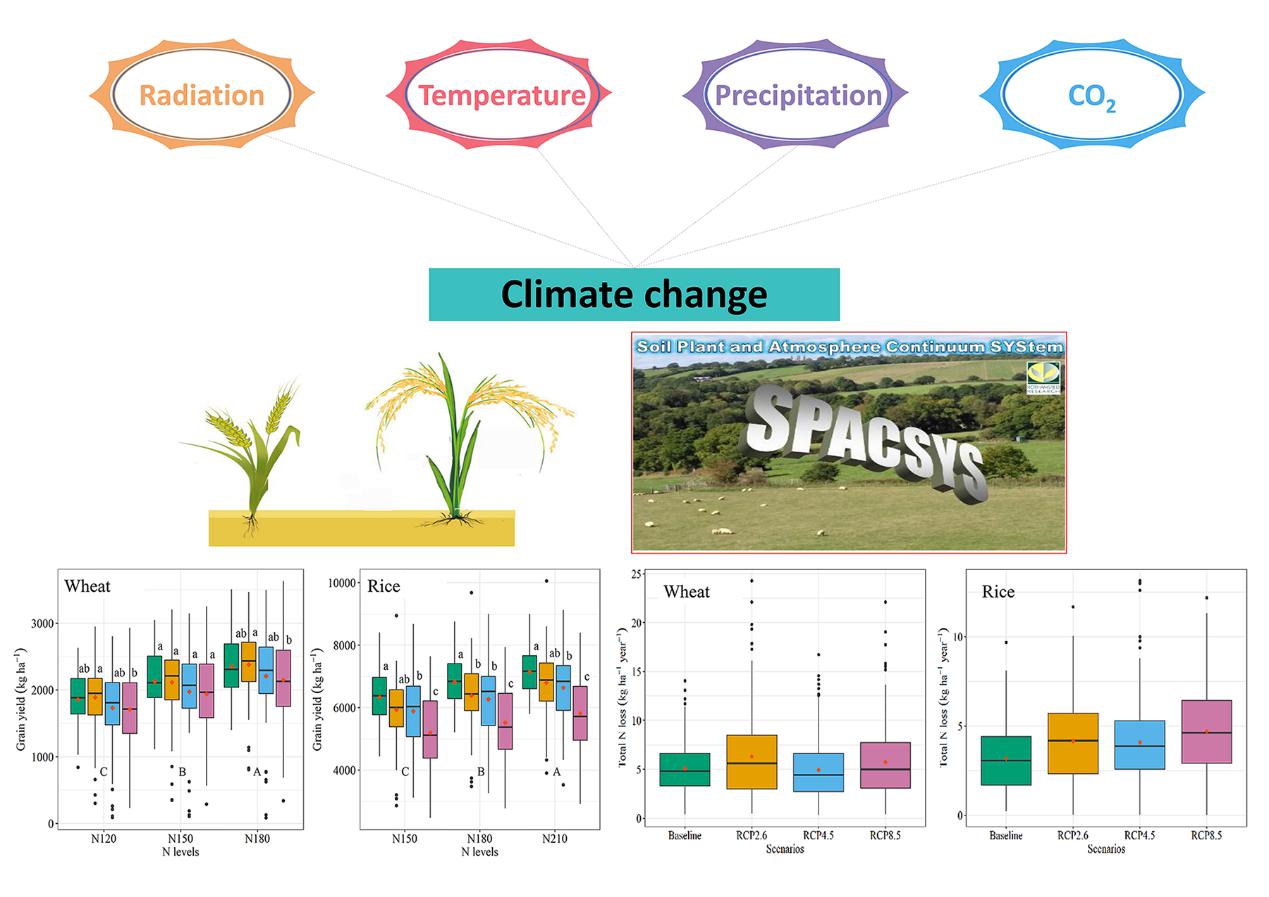 武汉植物园农业环境生态学科组博士生刘闯在武汉植物园陈防研究员、刘毅副研究员与英国洛桑研究所Lianhai Wu研究员等老师共同指导下,通过作物生长模型-SPACSYS系统模拟与研究了气候变化对我国南方水稻-小麦作物系统下作物生产、环境效应及其综合适应策略。结果表明:1)SPACSYS作物生长模型能够有效模拟小麦和水稻的产量、地上生物量和氮素循环;2) 氮肥管理以及播种或移栽日期的改变可以大大减轻冬小麦-水稻轮作系统的产量损失和氮素贡献效率(ANCE)的降低;3) 生长季节的变化以及氮素管理的实践可能有助于缓解气候变化的进程;4) 推迟小麦播种和提前移栽水稻可以减少氮的淋失;5)气候变化与增施高量氮肥将间接增加水稻生长季N2O排放。该研究为我国南方水稻-小麦农田生态系统应对未来气候变化方面提供了理论基础。