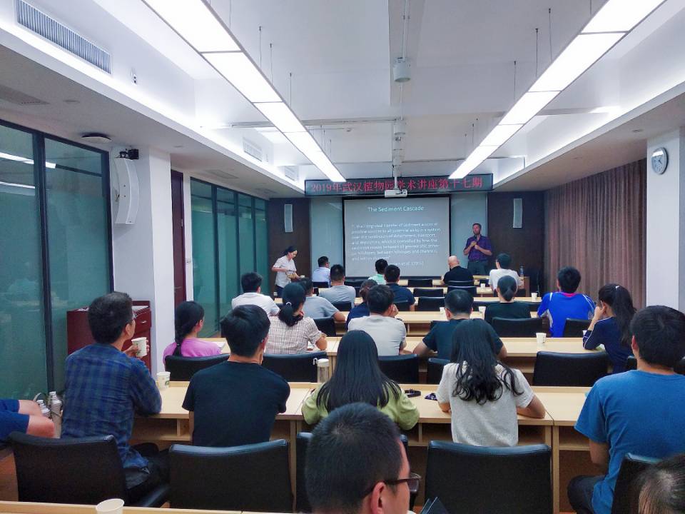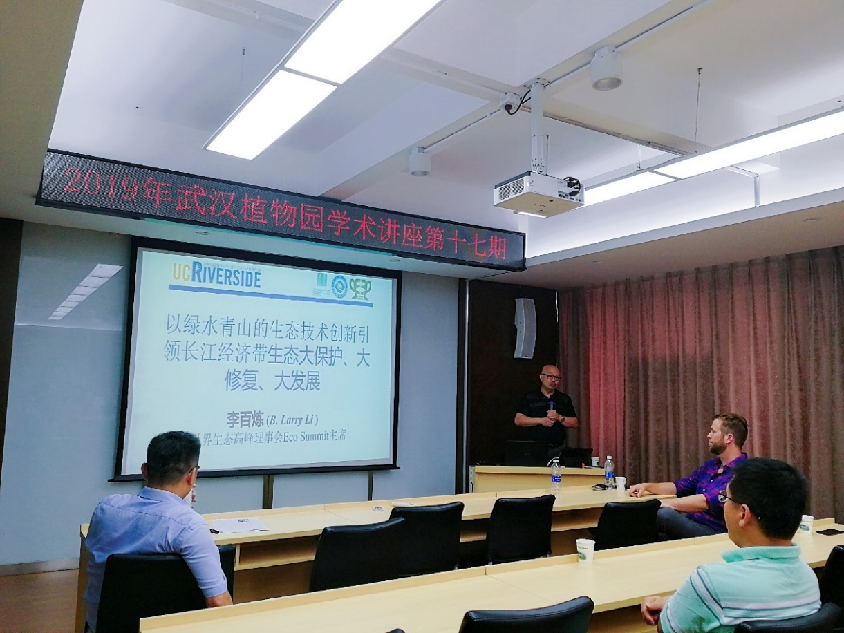 8月7日下午,应武汉植物园主任张全发研究员邀请,美国加州大学河滨分校李百炼教授、Andrew Gray助教至我园进行学术访问。 两位老师分别就各自的研究领域做学术报告。李百炼教授围绕“以绿水青山的生态技术创新引领长江经济带生态大保护、大修复、大发展”主题展开报告,首先从绿水青山理念出发,重申了生态文明的提出及目标,从生态学的角度切入并融合景观生态学及景观空间的概念,力争实现生态经济效益的统一,接着他通过举例阐明了水系生态治理防洪方案设计模型的核心理念。报告中,他分别讲述了“三位一体”的治理模式在水生态中的应用,水系自净化系统污染消减的四大要素及水系生态治理技术路线。最后他以武汉母亲河——府河为例论证了长江生态大保护的生态技术创新与经济发展的统一的巨大效益。Andrew Gray助教则以“集水区微小基质的动态对生态安全十分重要”为题,首先他对微小基质的定义进行了详细的说明,并指出由于其常会与水体中的重金属颗粒,寄生虫,营养物质,微生物等混合而在水体中传播,由它夹杂的污染物是破坏美国水生生态系统中的重要因素。与此同时,也明确指出基质夹杂的营养物质又是对人类、生态环境有利的重要资源,同时详细解释了影响基底的动态的因素。目前在美国水生生态系统中有关集水区的基质数据还很缺乏。最后介绍了目前相关研究采用的网络建模,实时监控等方法。