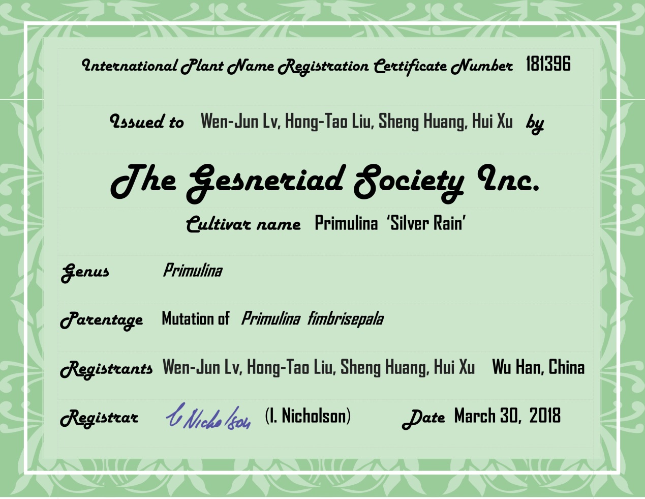 近日,由武汉植物园刘宏涛、吕文君等人培育出的3个苦苣苔科报春苣苔属植物新品: “晨光”Primulina Morning Light’ “白月光” Primulina White Moonlight’ 和“银雨” Primulina Silver Rain’喜获国际苦苣苔科植物新品种登录权威认证机构——世界苦苣苔科植物协会(The Gesneriad Soceity)授予的认证证书,其品种名已经获得了国际认证。