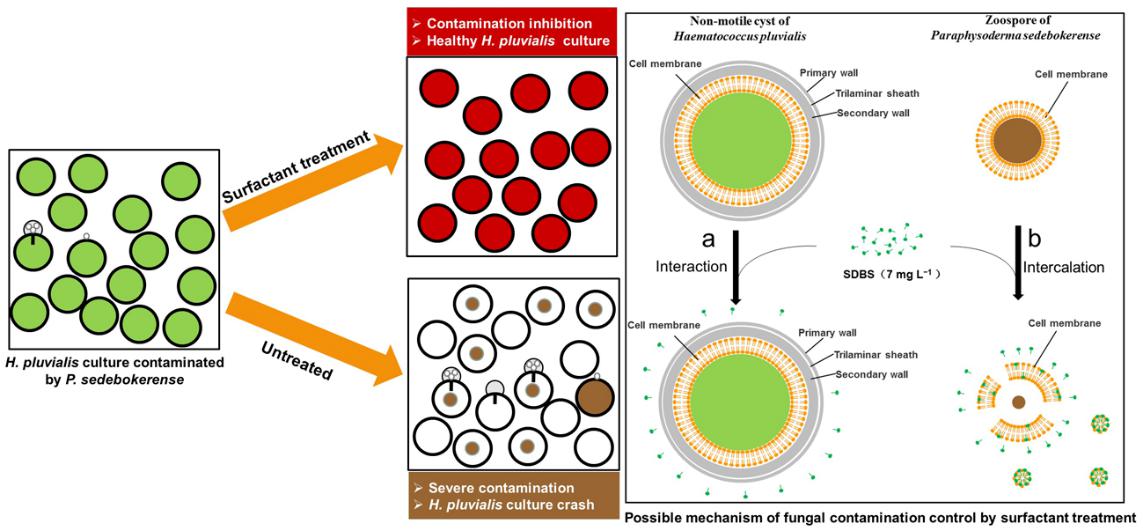 研究成果已申请中国技术发明专利“一种利用表面活性剂防治红球藻培养过程中真菌感染的方法”(201811049012.8),并以“Application of surfactants for controlling destructive fungus contamination in mass cultivation of Haematococcus pluvialis”为题,发表于生物工程技术类TOP期刊Bioresource Technology (IF2019 =7.539)。武汉植物园微藻生物技术学科组丁奕副研究员和博士生张奥棋为论文的共同第一作者,李夜光研究员为通讯作者。该研究得到国家自然科学基金项目(31702367)的资助。