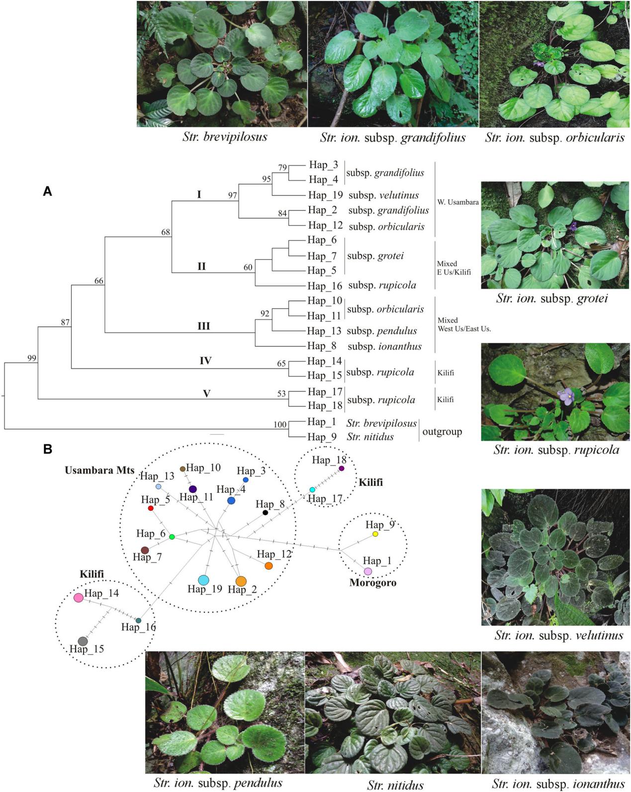 Streptocarpus ionanthus复合体中已界定的9个亚种,其中1个分布于肯尼亚沿海,而另外8个分布于坦桑尼亚。坦桑尼亚的乌萨姆巴拉山为该复合体的分布热点区域,坦桑尼亚分布的8个亚种在此处均有分布。武汉植物园的研究人员,利用核微卫星和叶绿体微卫星序列对Str. ionanthus开展了群体遗传学和谱系地理学研究。研究人员估算了叶绿体DNA单倍型的分化时间,并对Str. ionanthus历史上的、现在的和未来的分布模式进行了建模。该研究共收集了7个亚种的21个居群,采样覆盖了Str. ionanthus的整个分布区范围,与之关联物种Str. nitidus和Str. brevipilosus在本研究中采集了两个居群为代表。