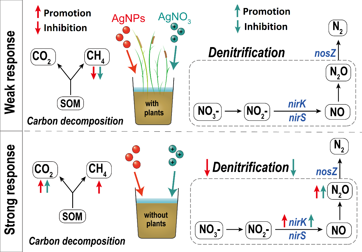 研究结果发现:纳米银释放了大量的银离子,改变了植物生长和养分吸收,在短期内抑制了植物缺失土壤的反硝化速率,加强了土壤温室气体(CO2、CH4和N2O)排放,而且纳米银比硝酸银对碳排放的促进效应更强(图1)。在有植物生长时,纳米银对土壤反硝化速率以及CH4、N2O排放无显著影响。研究表明水生植物可以通过吸收银离子、改变土壤理化性质以及调控功能微生物群落等多种途径来缓解纳米银对生态过程的短期负面作用。