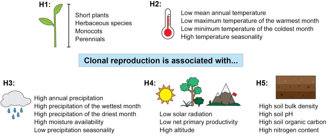 研究结果表明,克隆植物的概率与植物特征的关系更强烈,与环境变量的关系相对较弱。矮小植物、草本、单子叶植物更可能进行克隆繁殖,并且克隆植物在低温、低太阳辐射、高水分供应、高净初级生产力和高土壤有机碳和氮含量的环境中更常见。高大植物、木本、双子叶植物通常只能有性繁殖,并且非克隆植物在干燥和土壤贫瘠的环境中更常见。这一重要发现将推进人们对植物繁殖策略大尺度格局及两种繁殖方式进化意义的理解。表明克隆繁殖是植物在资源丰富的环境下进行种群扩张的策略,而不是在环境胁迫条件下替代有性繁殖的保障策略。