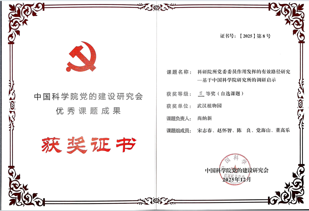 本次评选中,武汉植物园申报的“科研院所党委委员作用发挥的有效路径研究—基于中国科学院研究所的调研启示”课题在现场参与汇报交流,凭借扎实的调研基础与务实的实践价值,被授予“中国科学院党的建设研究会优秀课题成果”称号,荣获自选课题类三等奖。