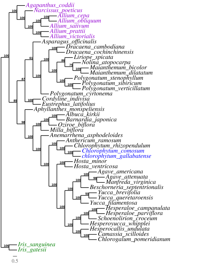 吊兰属(Chlorophytum),是一个物种较多而又极为复杂的属,隶属于天门冬科(Asparagaceae),包含215种,6亚种,14变种,具有重要的观赏和药用价值,特别在园艺上,占据着重要地位。新一代测序技术使得基因组测序成本急剧下降,每年都有大量物种的叶绿体基因组信息被揭开,数据被广泛应用于植物系统学研究。当前,吊兰属叶绿体全基因组数据有限,在NCBI数据库中仅有C. rhizopendulum一种,制约了本属植物的系统发育研究。