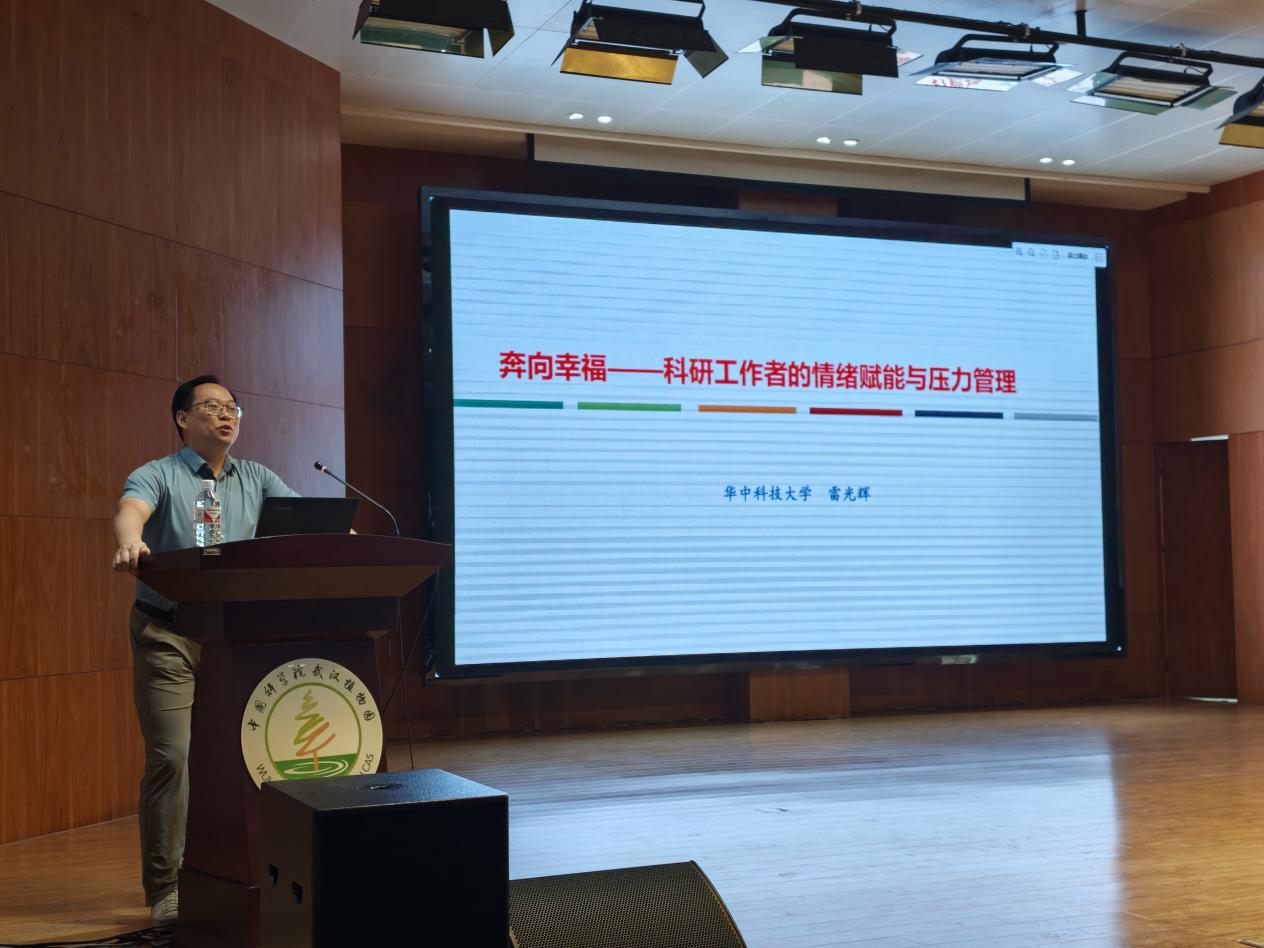 雷光辉作“奔向幸福——科研工作者的情绪赋能与压力管理”专题辅导报告,深入浅出地讲解了心理健康的基本概念、影响因素以及应对策略,并就如何调节情绪和管理压力提出了具体的建议和方法。