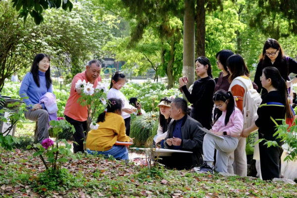 下午刘老师与参与活动的公众一同来到武汉植物园牡丹园现场写生,清明时节正值牡丹盛放的最佳观赏期,各色牡丹竞相吐艳,阵阵清香沁人心脾。在春日的花木掩映下,刘老师一边作画一边讲解,引导大家用植物分类学的眼光观察花鸟形态,将上午讲座中提到的“迁想妙得”“格物致知”化为笔下的生动线条。